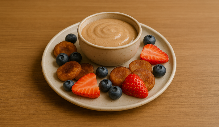 - 7.Para el armado, colocar los bites en un plato y decorar con las fresa y arándanos o frutas de elección. Acompañar con la crema