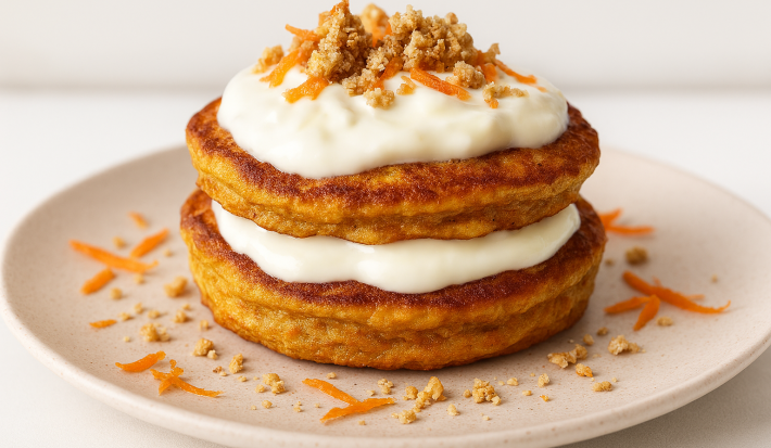 - 5.En un plato mediano, colocar un crep de zanahoria agregar una cucharada de la crema, volver a repetir el proceso una vez más y decorar con pecanas trozadas y canela.