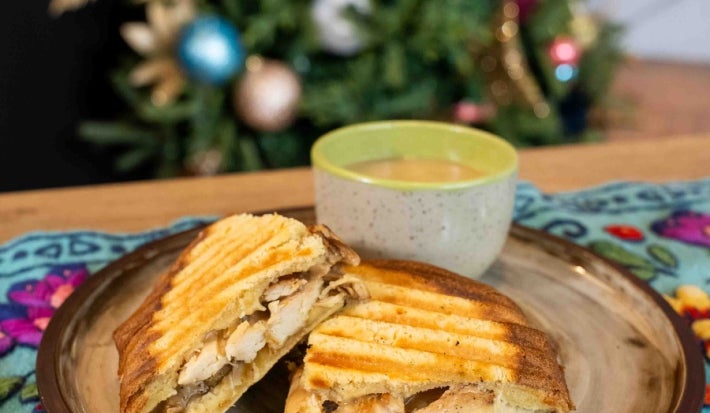 - 2.Colocar las láminas de pavo sobre el pan dulce, agregar un poco de la salsa gravy, condimentar con un poco de sal, tapar con la otra tajada de pan dulce y llevar al panini por un mínimo de 45 segundos o hasta que esté totalmente dorado.